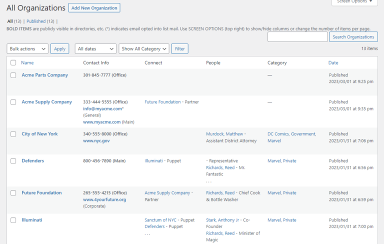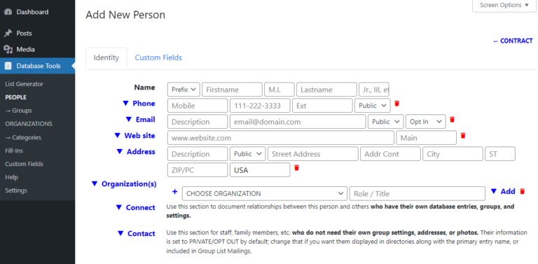 - Tags: Create your own groups/categories (custom WordPress taxonomy) for purposes of email, merge, directories, etc. Send a message to everyone in a committee with just one click!