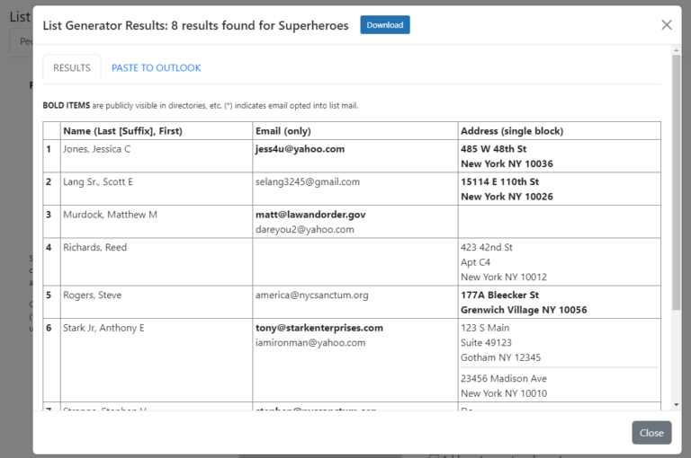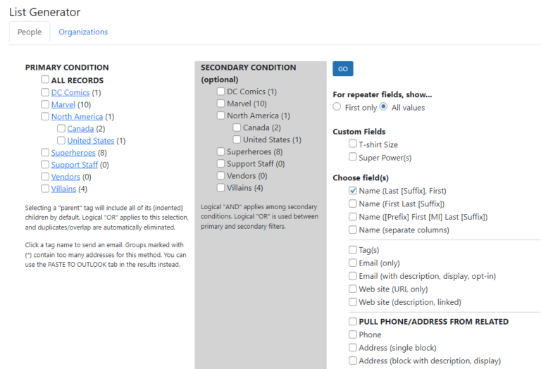 - List Generator: Export information for groups, with fields/columns of your choice (including custom fields). Easily generate a list of names, emails, addresses, etc. Download a spreadsheet for merge purposes, or paste to Outlook.